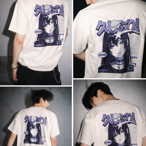 Anime Girl Graphic T-Shirt — Japanese "久しぶり!" Retro Violet Back Print